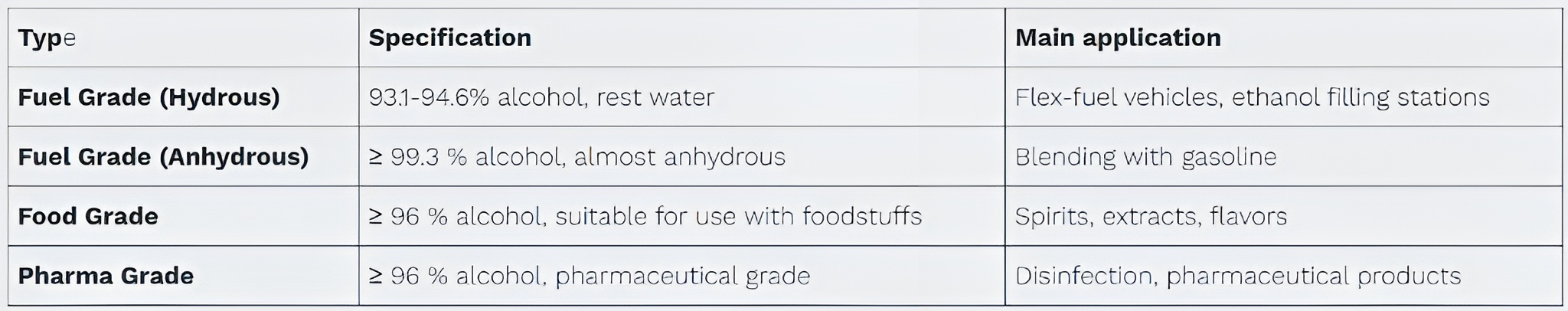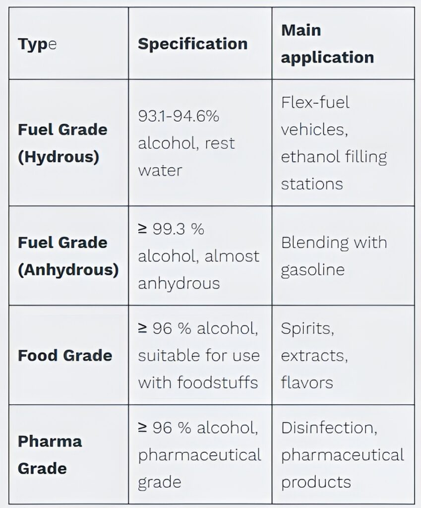 - Fuel grade ethanol (hydrous and anhydrous) – fuel blend or direct fuel