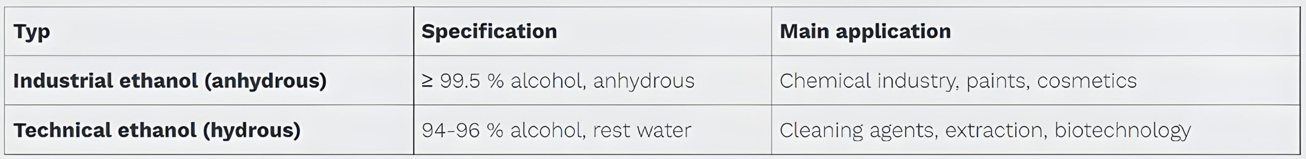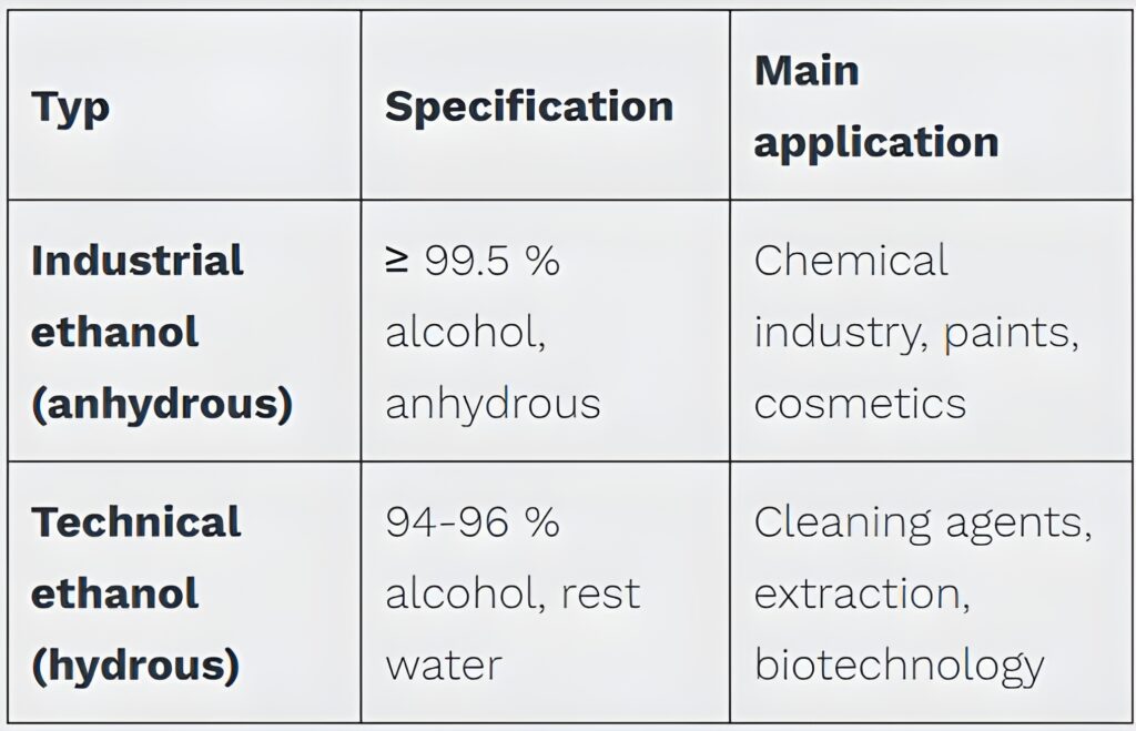 Industrial ethanol is a technical alcohol for industrial purposes, while sugar cane ethanol is mostly used for fuel, food and pharmaceutical applications.