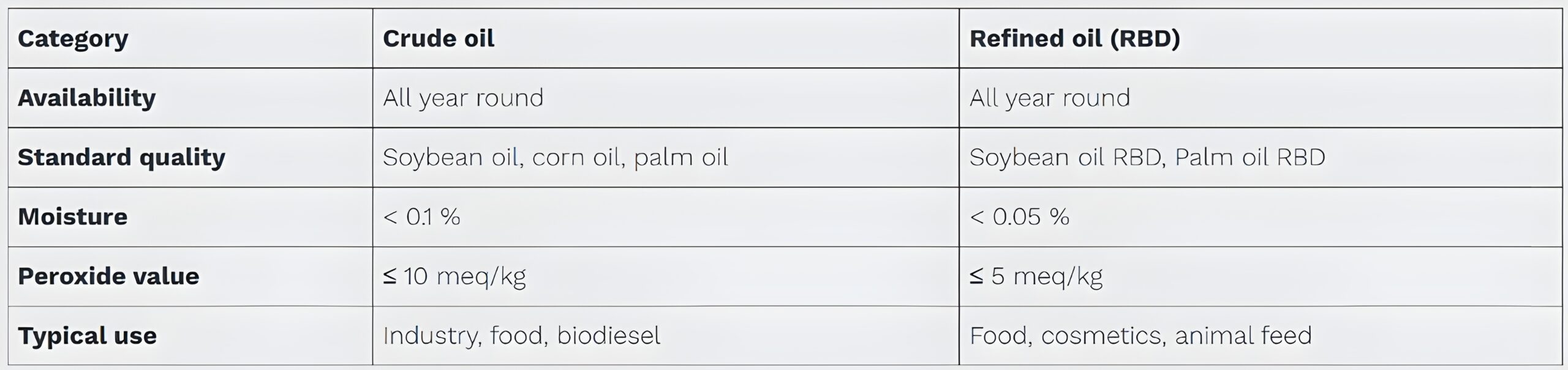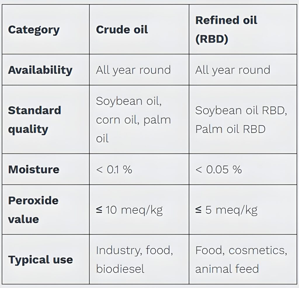 • Soybean oil, maize germ oil, palm oil – as crude or RBD quality (refined, bleached, deodorized)